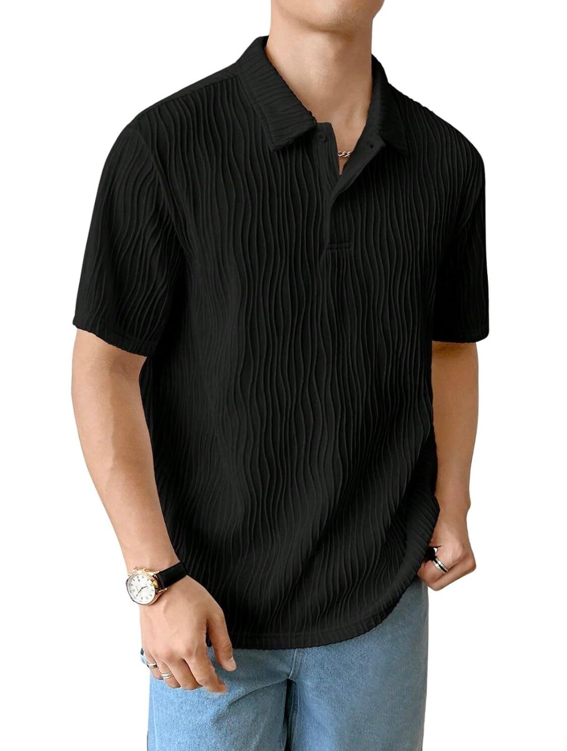 This men’s polo or colored t-shirt is designed to offer a clean appearance suitable for casual outings.