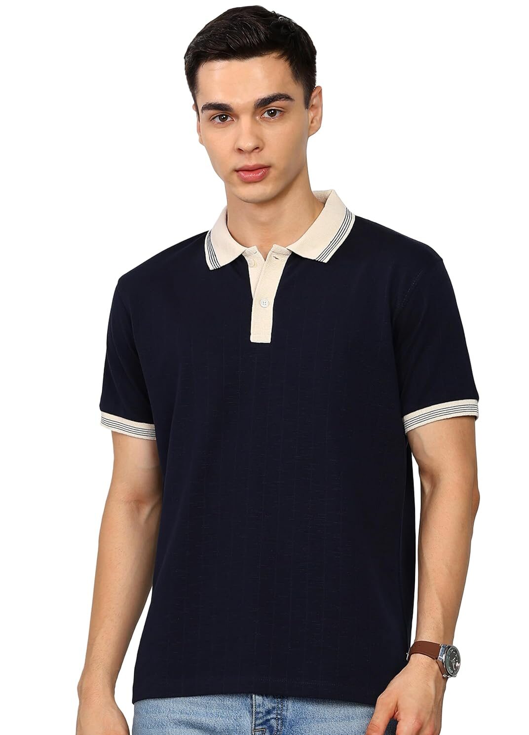 This men’s polo or colored t-shirt is designed to offer a smart casual look suitable for casual outings.