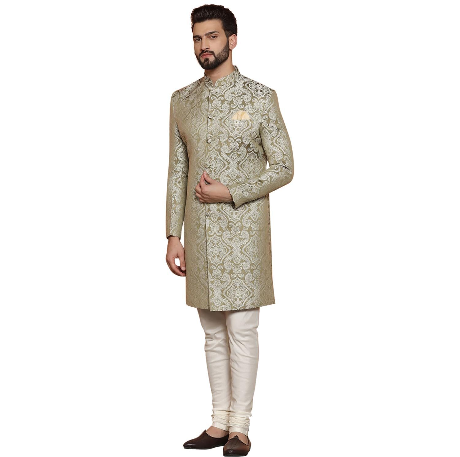 This men’s sherwani is crafted to enhance classic Indian wear by combining rich fabric appeal in one distinguished outfit.