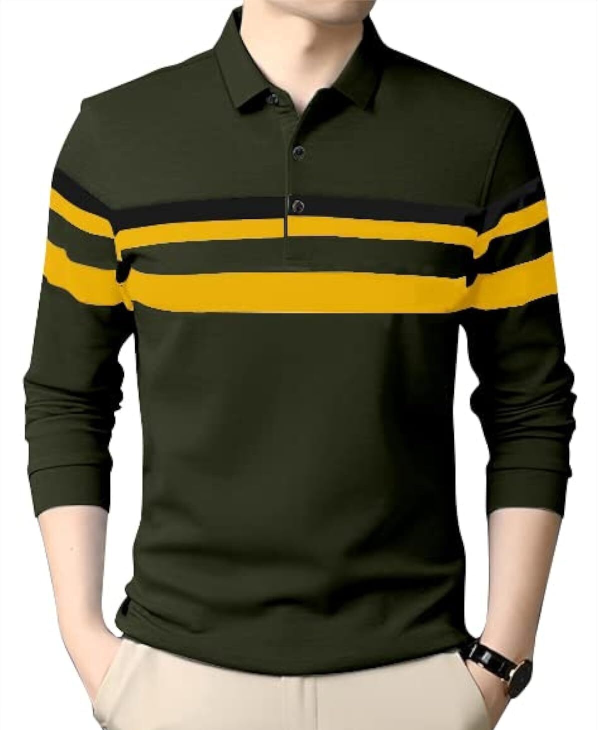 This men’s polo or colored t-shirt is designed to offer a clean appearance suitable for casual outings.