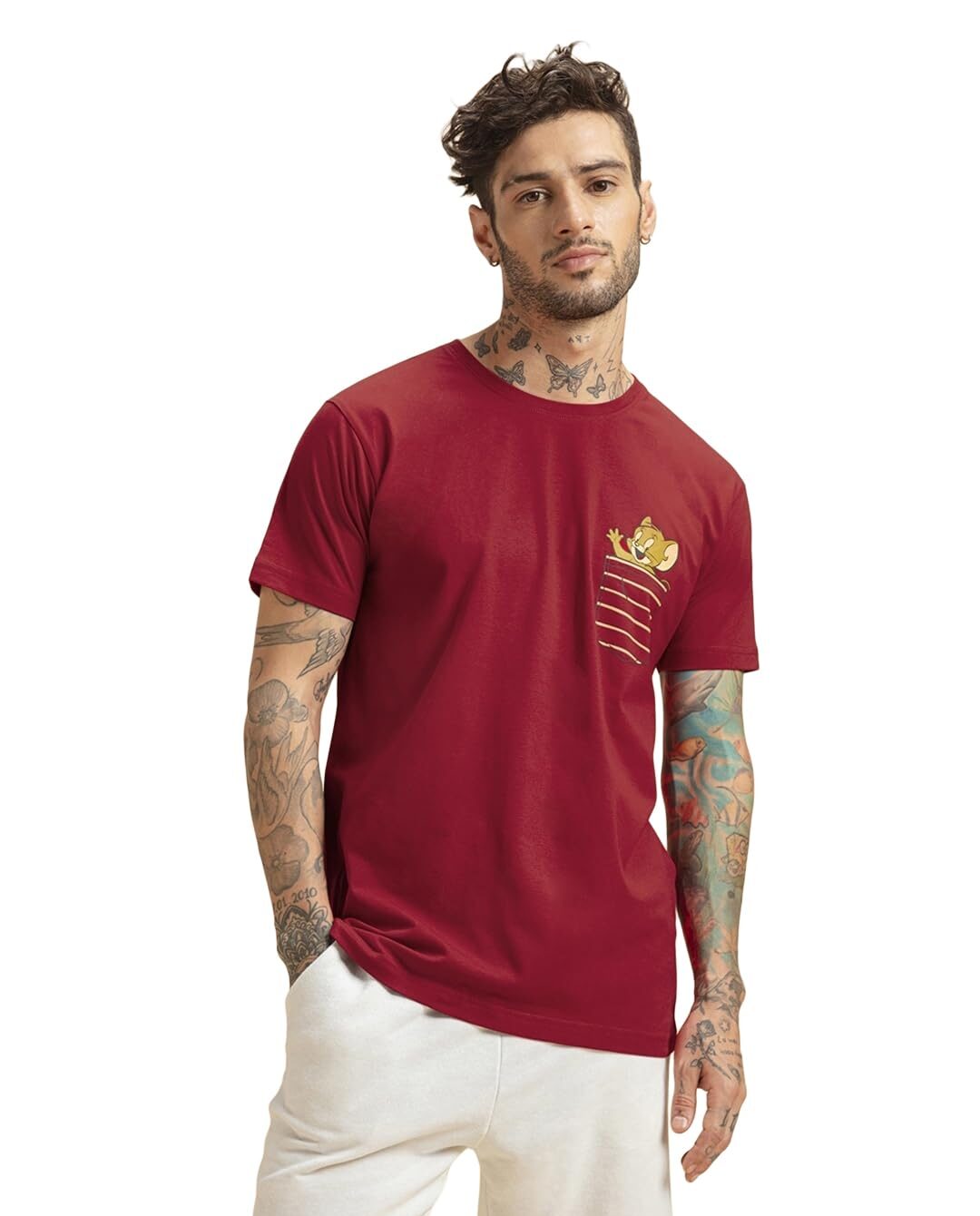 With a simple structure, this t-shirt pairs well with track pants for a casual look.